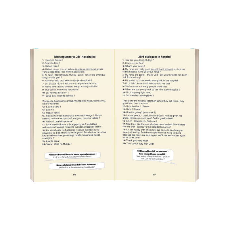 This book is ideal for intermediate levels and will help you master SWAHILI. Indeed, it is essentially centered on practical teachings which will allow you to get used to the melody of the language. This book contains 50 dialogues (accompanied by audio recordings). In short, this book will help you break the language barrier.
